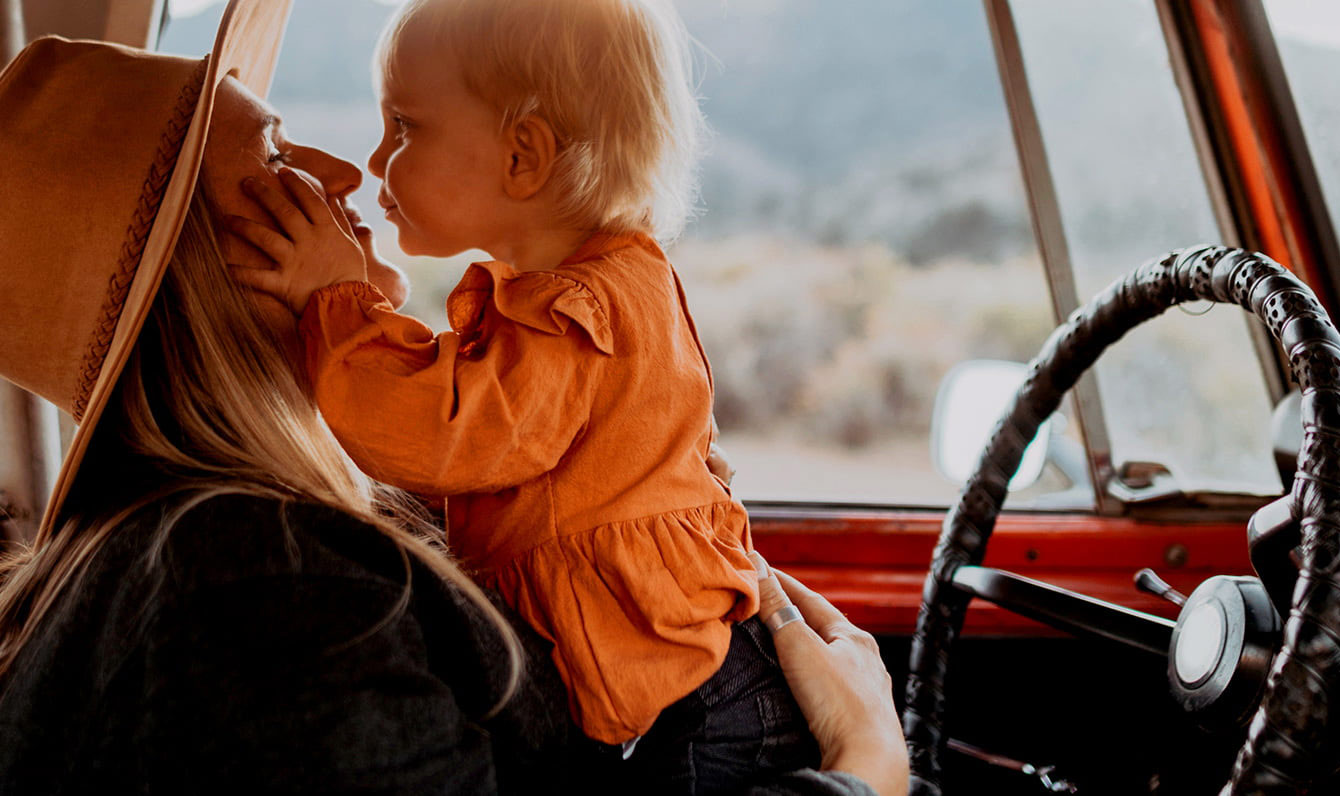 A woman kisses her child in the front seat of a truck.